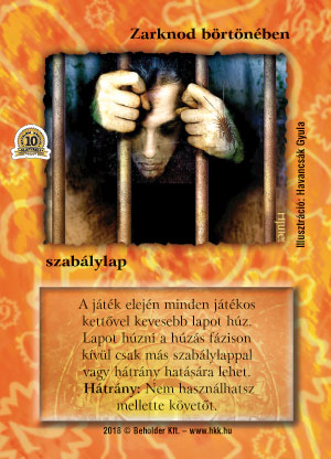 Szöveg: A játék elején minden játékos kettővel kevesebb lapot húz. Lapot húzni csak a húzás fázisban lehet, csak más szabálylappal lehet húzni a húzás fázison kívül. Ha egy lap hátránya az, hogy az ellenfél lapot húz, az ilyen hátrány továbbra is működik. Zarknod börtöne mellett nem használhatsz követőt.