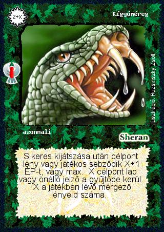 Kiadás: Ébredés Gyakoriság: nem gyakori Lapszín (isten): Sheran Típus: azonnali Szöveg: Sikeres kijátszása után célpont lény vagy játékos sebződik X+1 ÉP-t, vagy max. X célpont lap vagy önálló jelző a gyűjtőbe kerül. X a játékban lévő mérgező lényeid száma. Illusztráció: Ruzsinszki Zsolt