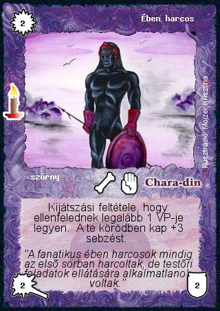 Kiadás: Múltidéző Gyakoriság: gyakori Lapszín (isten): Chara-din Típus: szörny Szöveg: Kijátszási feltétele, hogy ellenfelednek legalább 1 VP-je legyen. A te körödben kap +3 sebzést. Szinesítő szöveg: "A fanatikus ében harcosok mindig az első sorban harcoltak, de testőri feladatok ellátására alkalmatlanok voltak." Illusztráció: Mojzer Krisztina